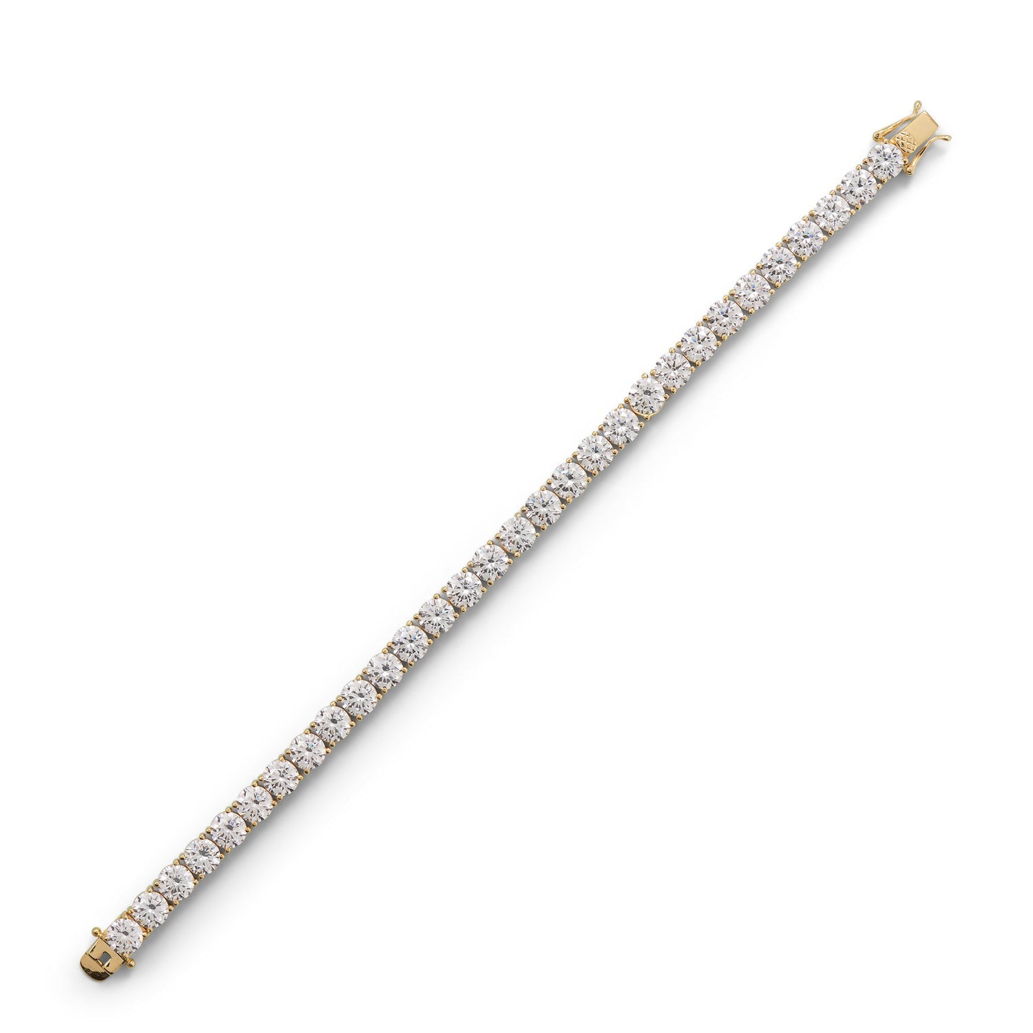 From the tennis courts to cocktail hour, this bracelet is a grand slam! 7.5" 14 karat gold plated sterling silver bracelet features (30) 6mm CZs with a box clasp closure. .925 Sterling Silver