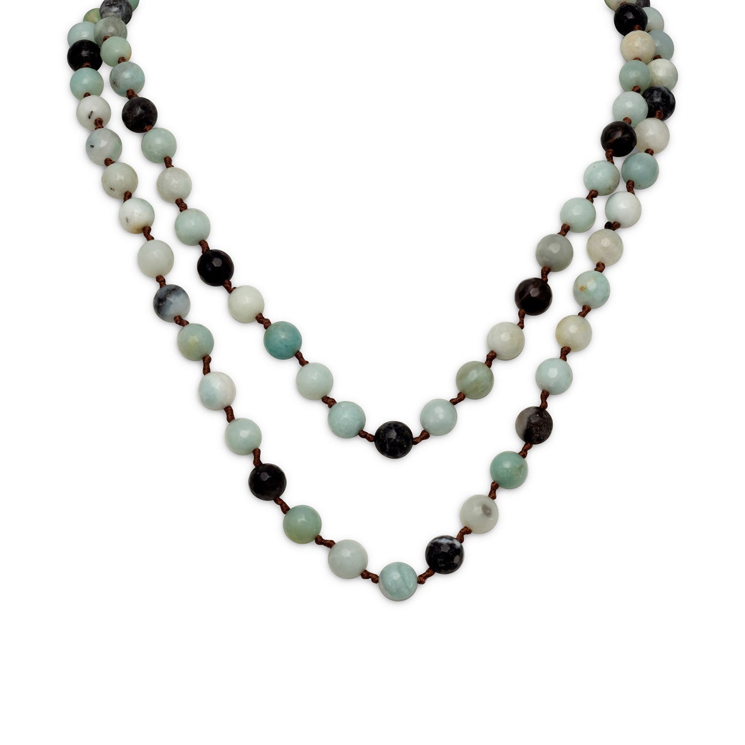 38" endless style knotted amazonite bead necklace in vibrant earth tones. The faceted amazonite beads measure approximately 8mm each.