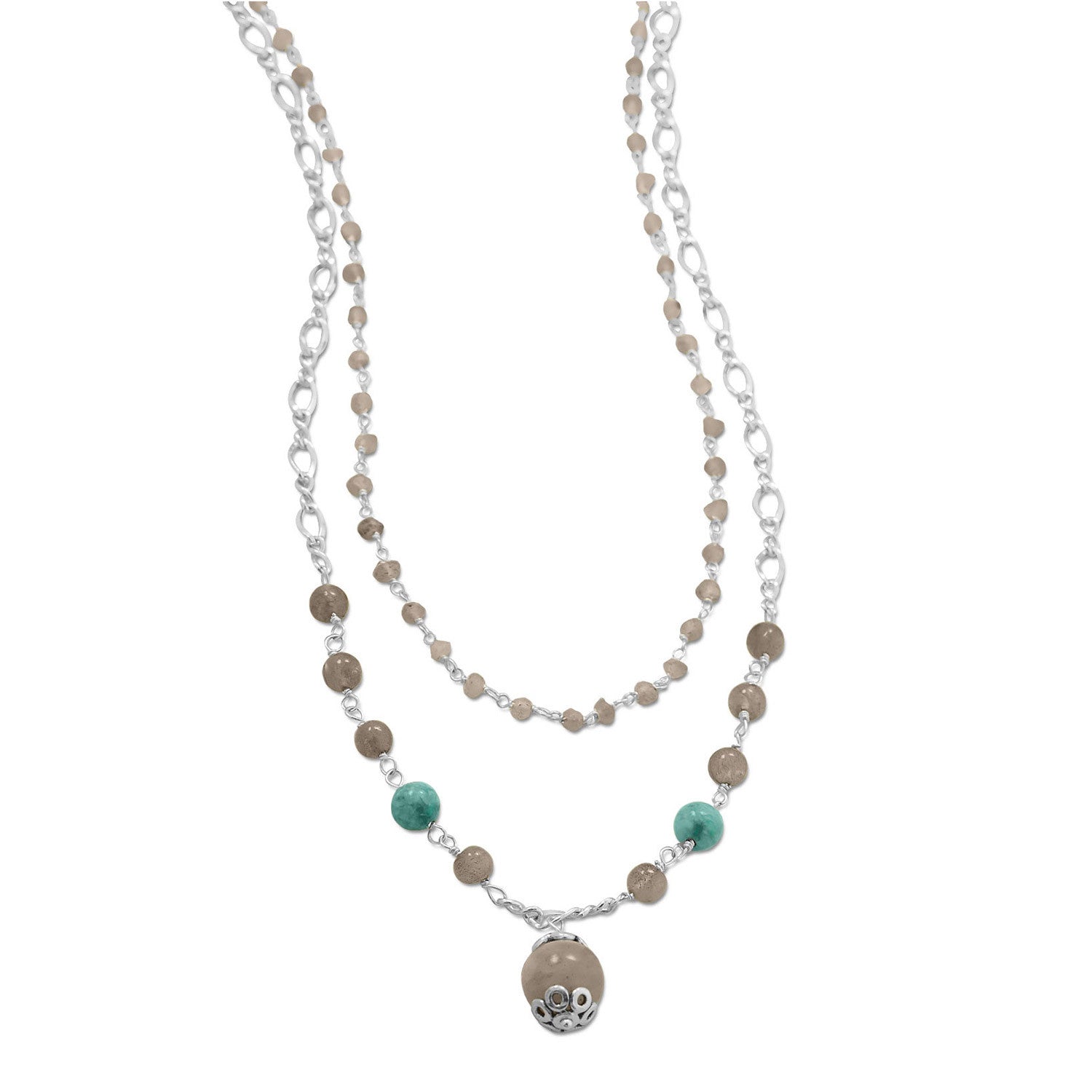 Add some artistic, designer allure to your collection with this double strand labradorite drop necklace. This necklace features a 17" strand of faceted labradorite on sterling silver wire, and an 18" strand of labradorite and amazonite beads paired with sterling silver chain. A 10mm labradorite bead drops from the 18" strand. This necklace has a lobster clasp closure. .925 Sterling Silver