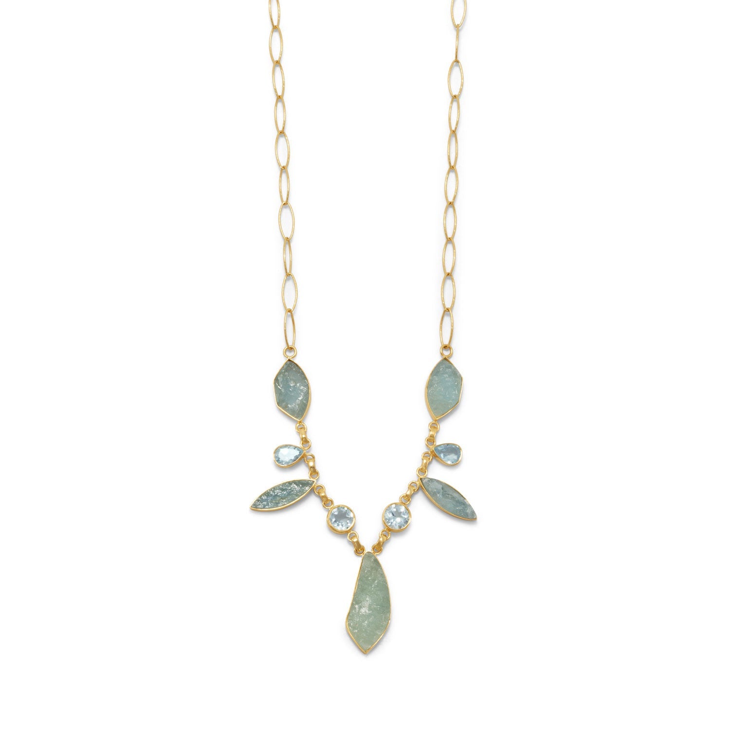 This gorgeous piece will turn heads. Statement necklace measures 18" with a 2" extension chain in 14 karat gold plated sterling silver with rough cut aquamarine and faceted blue topaz stones. The round faceted blue topaz stones are 8mm and the pear stones measure 6mm x 9mm. The rough cut aquamarine stones from the top to the largest center pendant measure 18mm x 10mm, 6mm x 20mm, and 13mm x 30mm. The chain is made up of marquise links that measure approximately 4mm x 12mm and are slightly textured and finished with a lobster clasp closure. .925 Sterling Silver