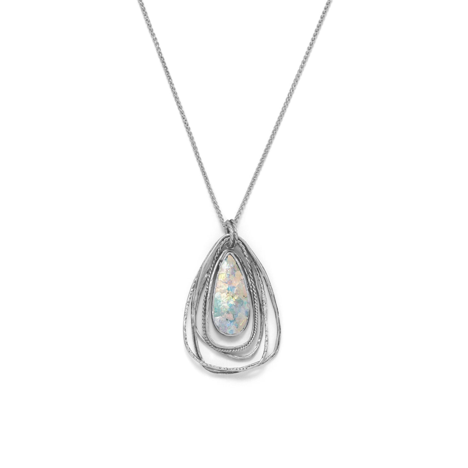 18" oxidized sterling silver wheat chain necklace with a two-part pendant. The pendant has a 24mm x 11mm ancient Roman glass pear drop with cut out abstract oxidized sterling silver fixed around it. That part of the pendant lays as an inset inside another cut out abstract oxidized sterling silver part. Neither pendant parts are fixed to the approximately 8mm pendant ring with rope edging. Ancient Roman glass coloring will vary. This necklace has a lobster clasp closure. Comes with Certificate of Authenticity .925 Sterling Silver