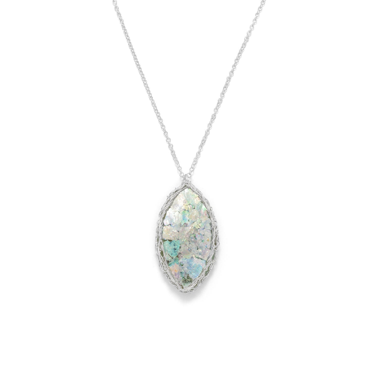 18" sterling silver rolo chain necklace with 41mm x 22mm ancient Roman glass marquise shape wrapped in hand woven wire mesh setting. Ancient Roman glass coloring will vary. This necklace has a lobster clasp closure. Comes with Certificate of Authenticity .925 Sterling Silver