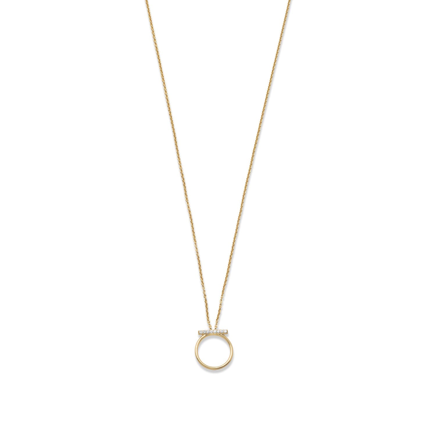 16" + 2" extension 18 karat gold plated sterling silver cable chain necklace featuring a 15.2mm open circle pendant with a 0.5" long horizontal bar on top. The horizontal bar has 8 individual prong set 1.3mm CZs. This necklace has a lobster clasp closure. .925 Sterling Silver