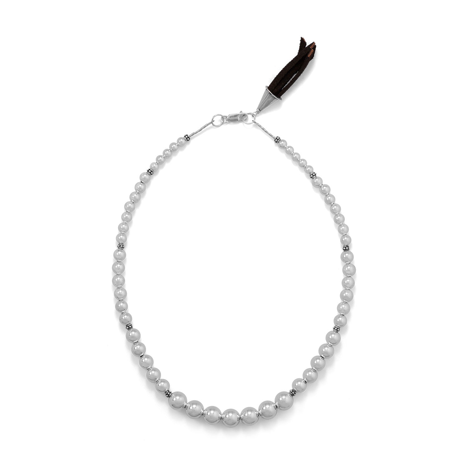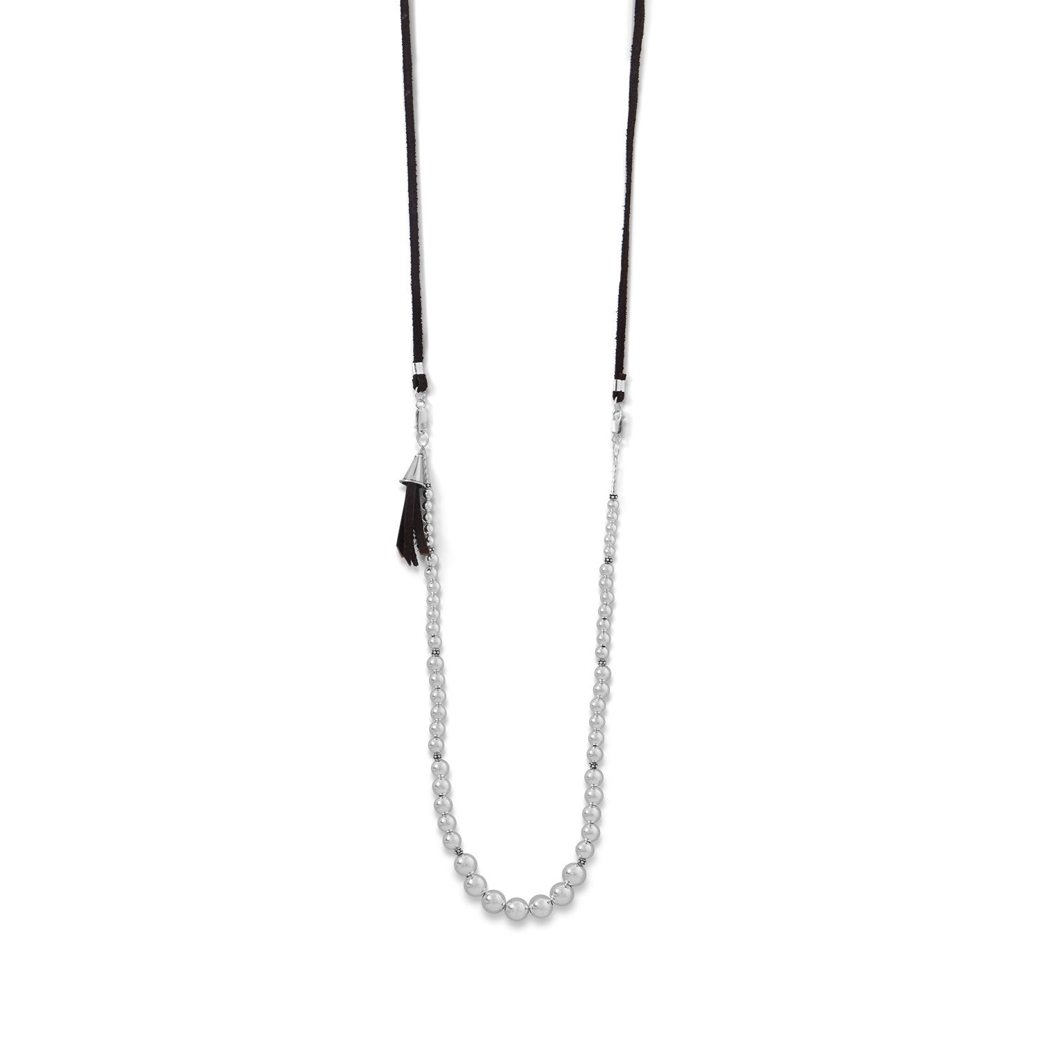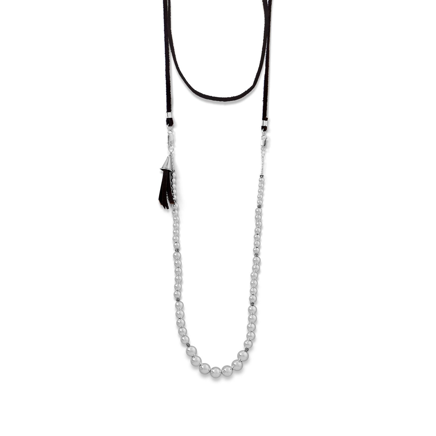 Necklines will no longer be a concern with this one of a kind necklace that can be worn four ways! Wear this necklace as a single 17" strand that has sterling silver beads graduating in size from 5mm, 6mm, 7mm, 8mm, to 10mm. Each round bead size is sectioned off with an oxidized sterling silver 3.8mm x 2mm decorative bead. This necklace has a lobster clasp closure and is finished with a 4 strand dark brown suede tassel fastened within an oxidized sterling silver cone bead. Or you can wear this necklace as a single 19" dark brown suede strand that connects with a sterling silver lobster clasp closure. You can also wear this necklace by attaching both single strands together to create a 36" long necklace that can be worn single or double wrapped! .925 Sterling Silver