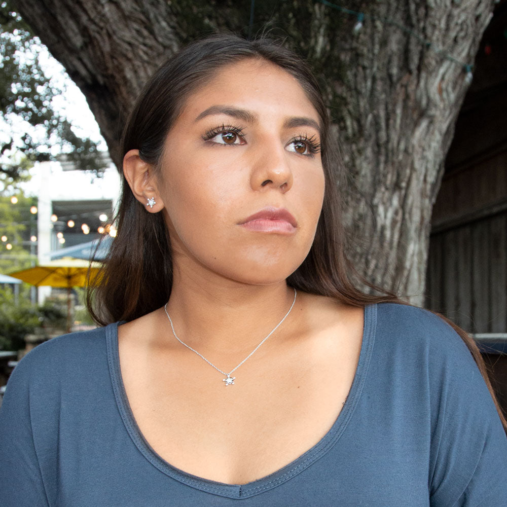 16" + 2" extension chain rhodium plated sterling silver CZ snowflake necklace. Snowflake measures 10.8mm with little glints of CZ sparkle. Featured on 1.2mm cable chain with lobster clasp closure. .925 Sterling Silver