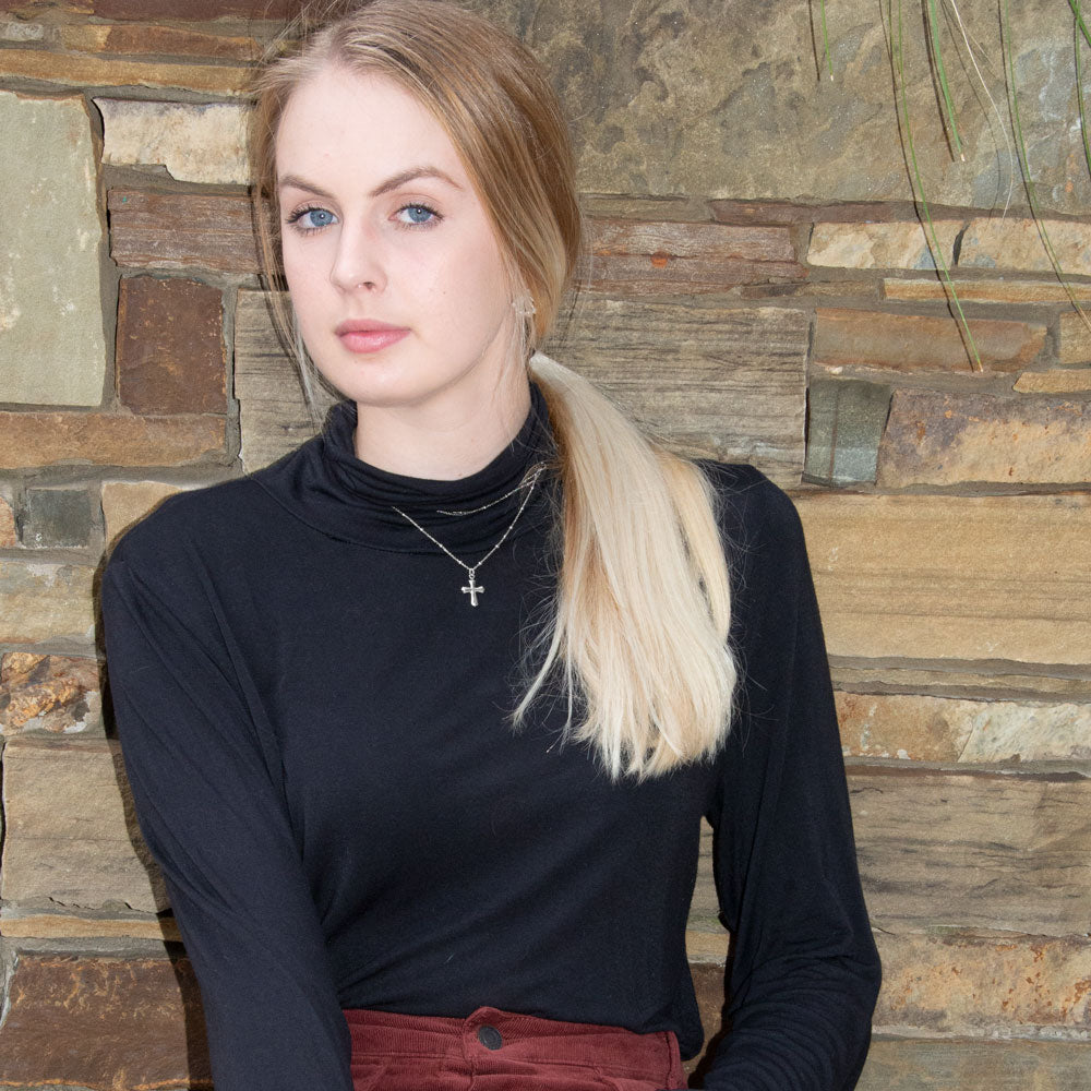 Rhodium plated sterling silver three row cable and bead satellite chain necklace with cross pendant. Double sided cross is 14.1mm x 16.1mm on 1.1mm cable chain with 2.6mm bead stations. Neckline measures 16", longest chain measures 18". Lobster clasp closure. Made in Italy .925 Sterling Silver