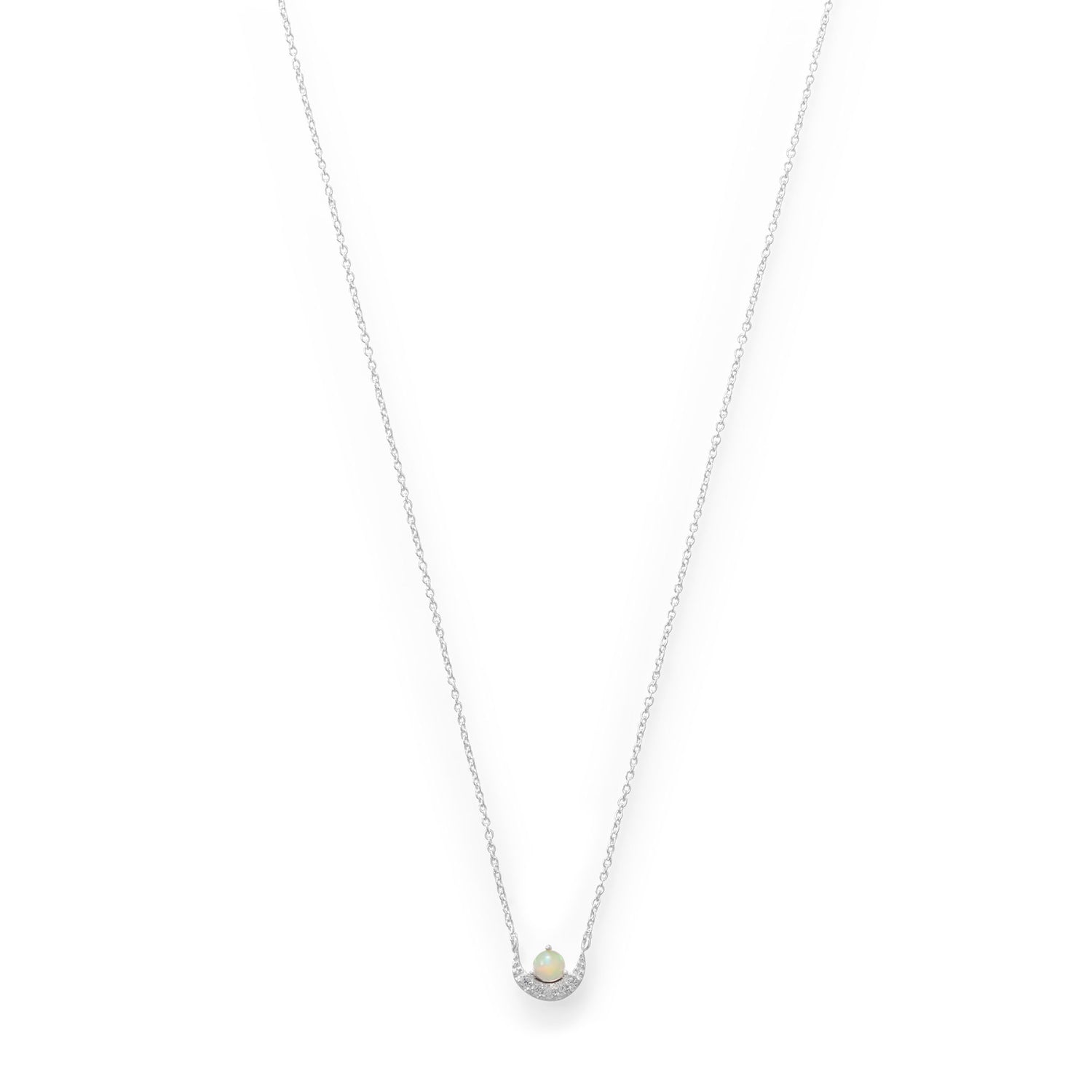 Shiny sterling silver 16" + 2" necklace. CZ crescent moon cradles a 4mm synthetic opal stone. Fixed pendant measures 9.6mm x 7.3mm on 1mm cable chain with lobster clasp closure. .925 Sterling Silver