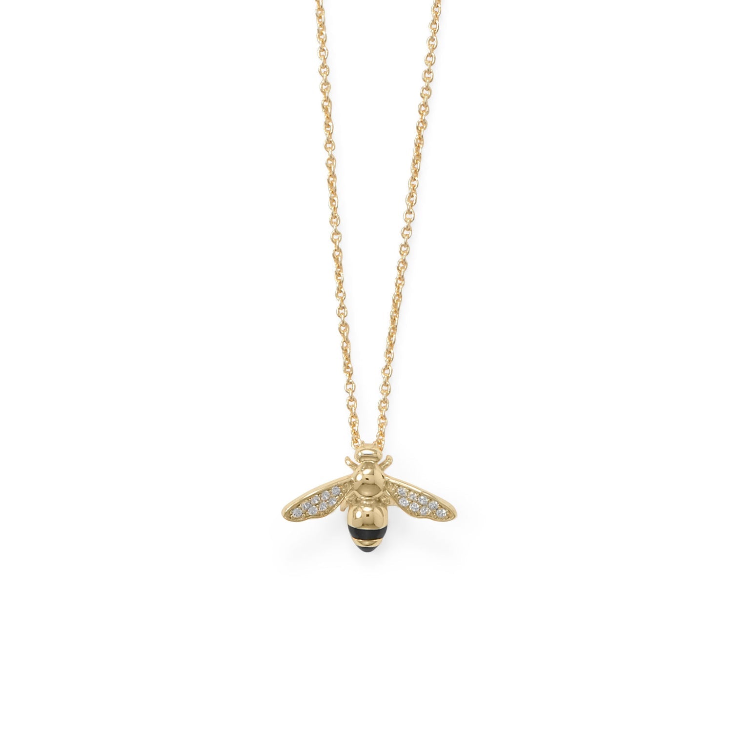 Sweet as honey bee necklace! 16" with 2" extension 14 karat gold plated sterling silver necklace. The bee slide measures 19.5mm x 12.7mm and the wings are embellished with Signity CZs. Slide is on 13mm cable chain and features a lobster clasp closure.  .925 Sterling Silver