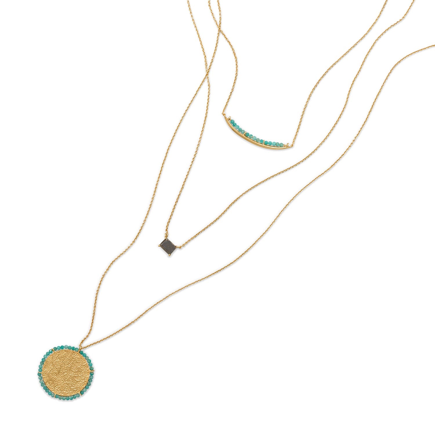 Three stands, three times the drama! 14 karat gold plated sterling silver three strand necklace features beautiful amazonite and labradorite! Strands measure 17", 26.5" and 30". Amazonite measures 2.2mm and labradorite stone measures 6.1mm x 8.1mm. Necklace features a lobster clasp closure and a 2" extension. .925 Sterling Silver