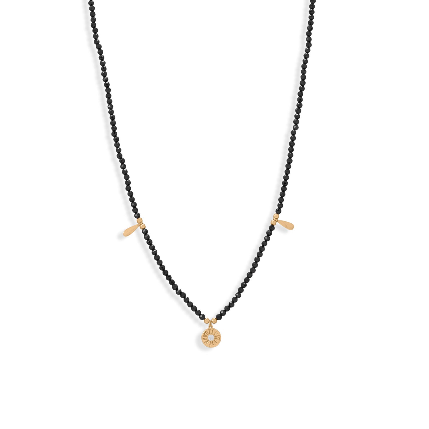 Neutral tones with pops of gold, perfect for everyday wear. 16" + 2" black spinel beaded necklace features 14 karat gold plated sterling silver beads and charms. Spinel beads are 2.4mm, gold pear drops are 2.8mm and 8.9mm, and CZ star charm is 7.8mm with 2.5mm CZ. Necklace features a lobster clasp closure.  .925 Sterling Silver  Pro tip: Layer for a more dramatic effect!