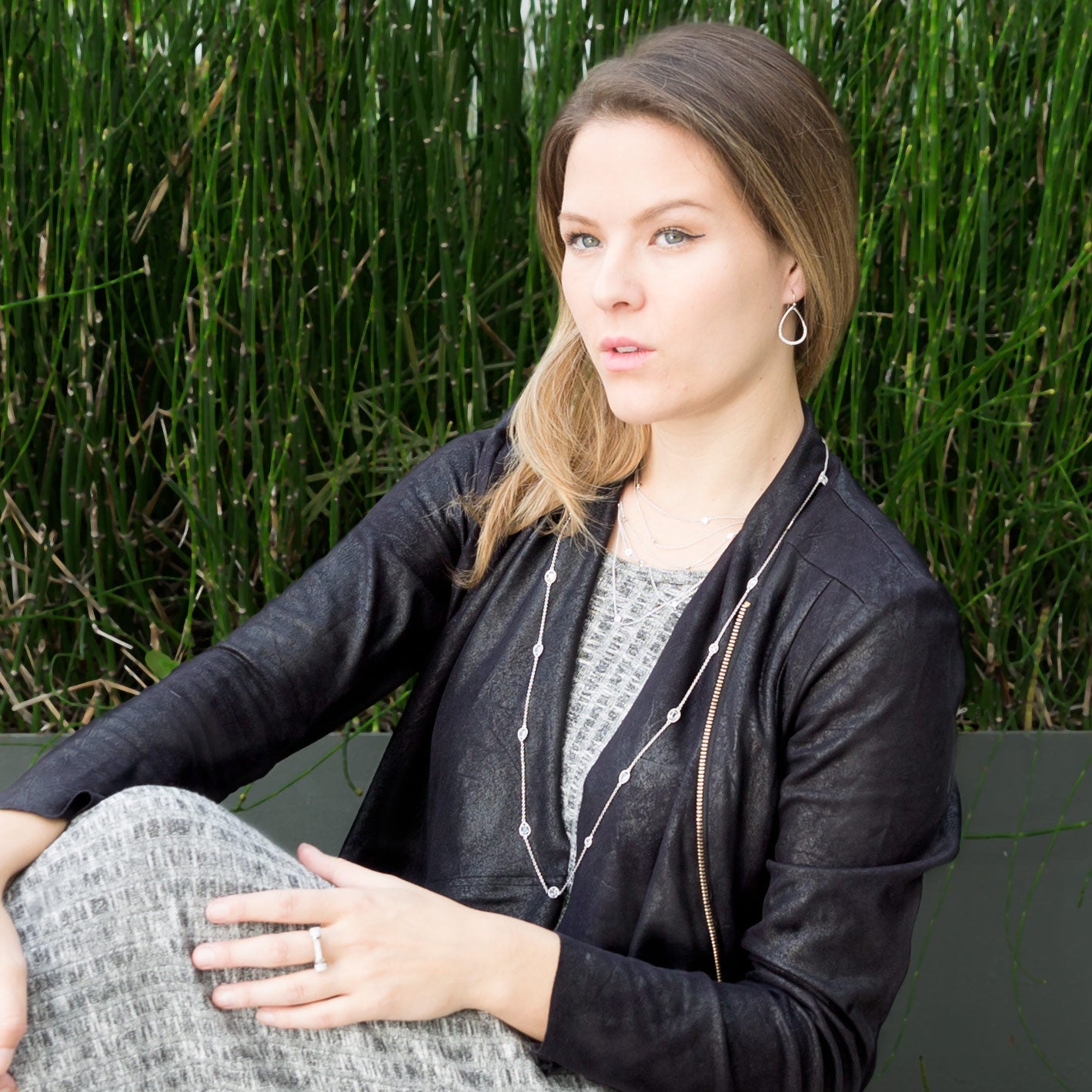 Rhodium plated sterling silver french wire earrings with pear shape drops accented with clear CZs. The cut out oval drop has clear CZs along the bottom half. The pear drop measures 18mm x 22mm. The earrings hang approximately 35mm. .925 Sterling Silver