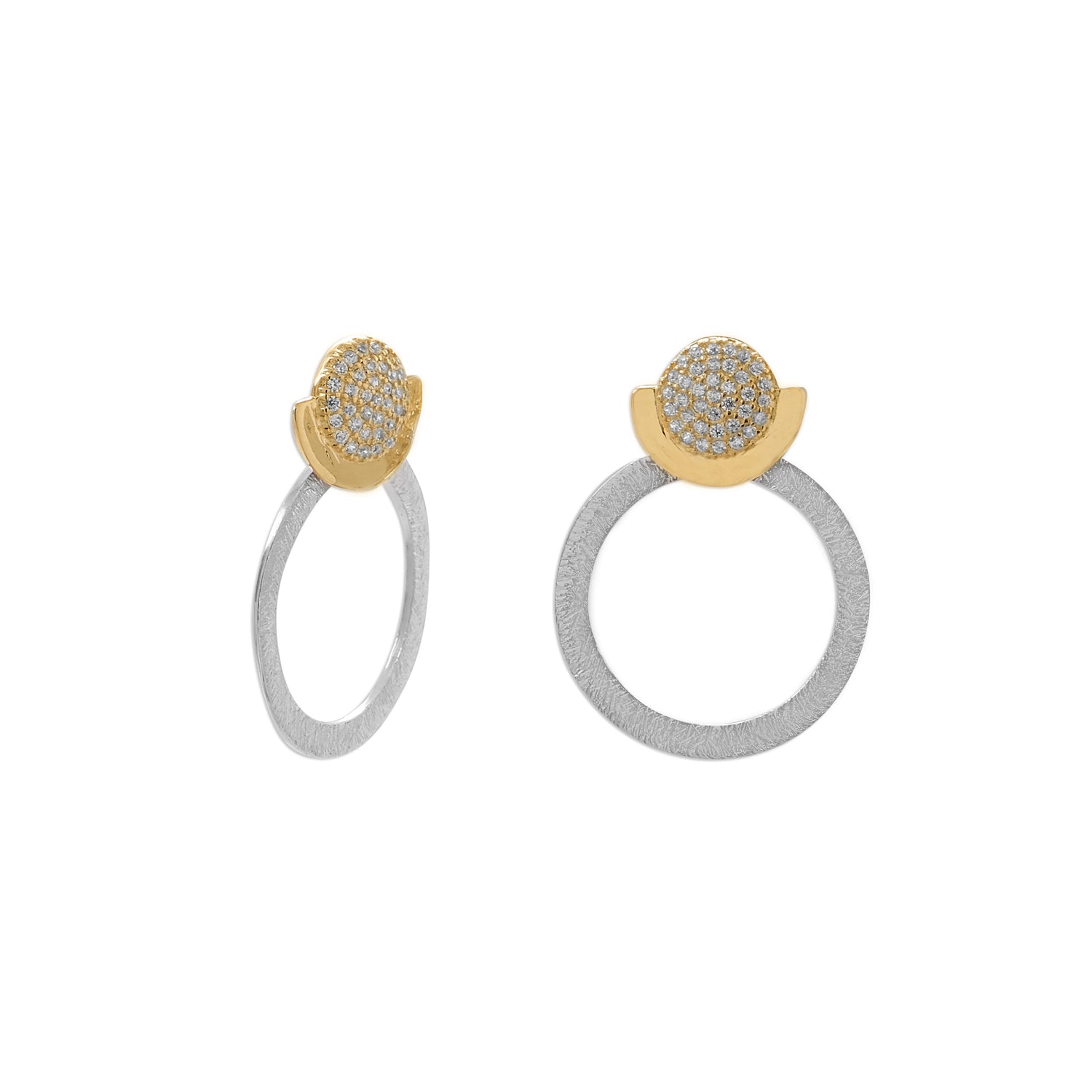 A touch of glam with these rhodium and 14 karat gold plated sterling silver post earrings. Post sparkles with 1mm pave CZ setting and measures 12mm x 10.2mm. Circle drop is 21.5mm with textured finish and dangles from a loop on back. Hanging length is 27.5mm. .925 Sterling Silver