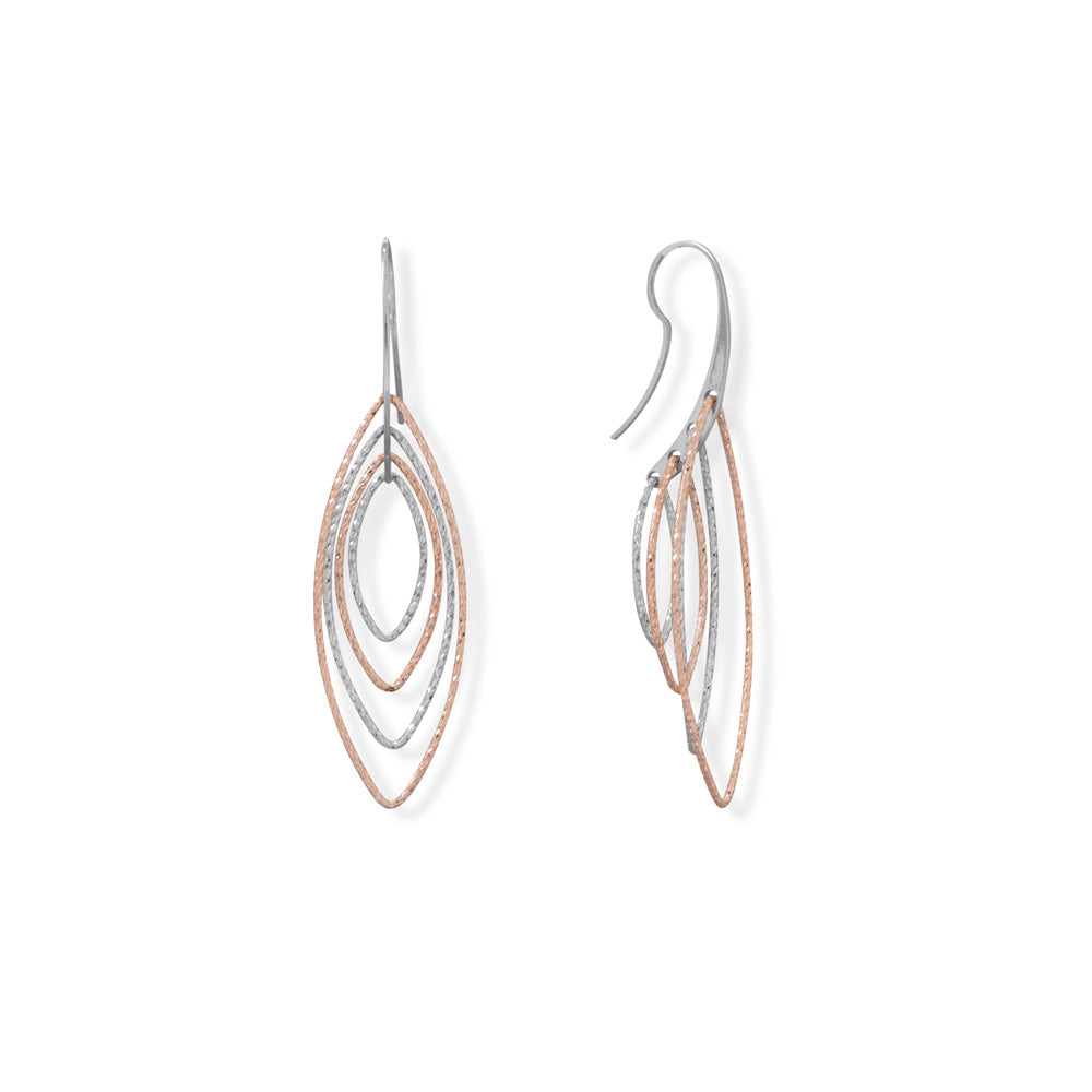 Simply magnificent! Rhodium plated and 14 karat rose gold plated sterling silver marquise rings come together to create these french wire earrings. Largest marquise is 17.5mm x 47mm and earrings have a total hanging length of 65mm. .925 Sterling Silver Made in Italy
