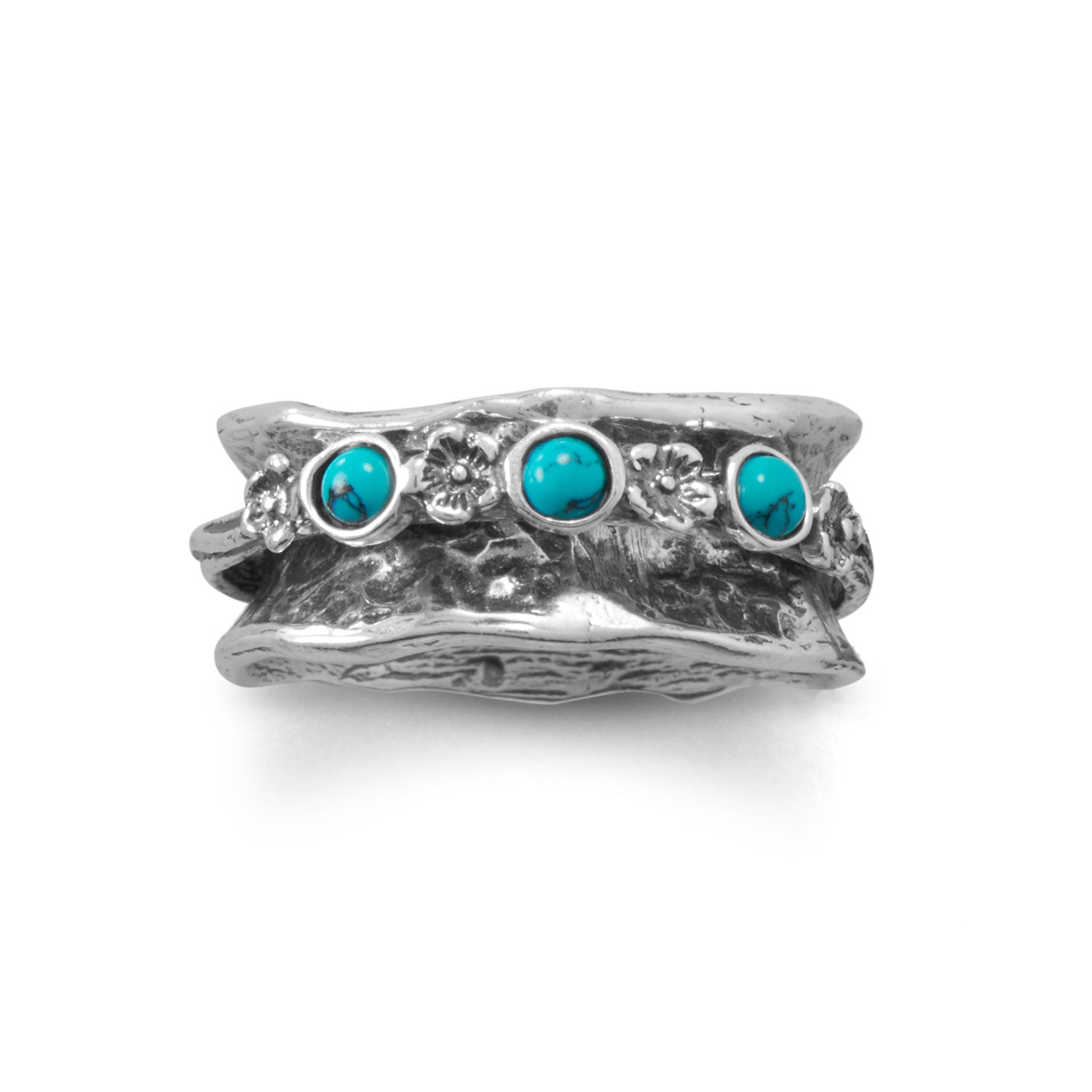 Oxidized sterling silver 10mm wide hammered organic shape band ring with a slight lip that encases an approximately 2.2mm wide branch style unfastened spin band that features alternating 3.3mm reconstituted turquoise stones and flower shapes. This ring is available in whole sizes 6-10. .925 Sterling Silver