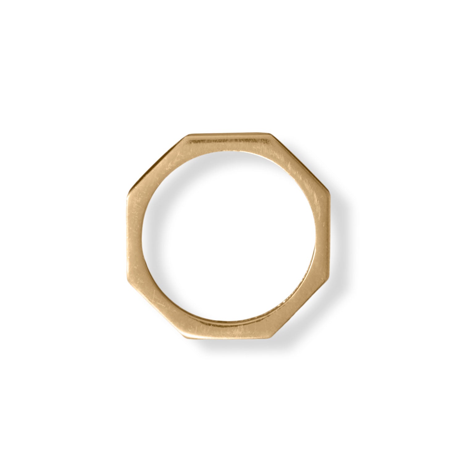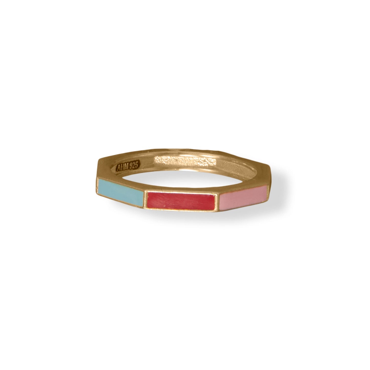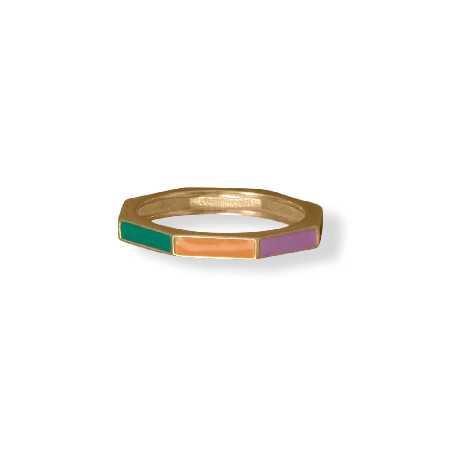 Bring some color into your life with this vibrant, funky ring! 14 karat gold plated octagonal ring features multi-color enamel panels. Buy multiples and stack em on! Ring is 2.8mm wide and available in whole sizes 6-10. .925 Sterling Silver